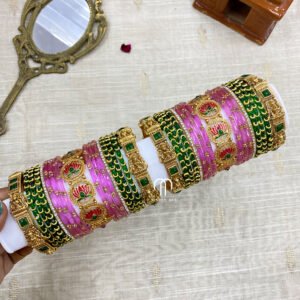 - Entire set contains 4- 3D kada Kundan Bangles, 2 – Parrot kada, Glass Bangles -24 Bangles.