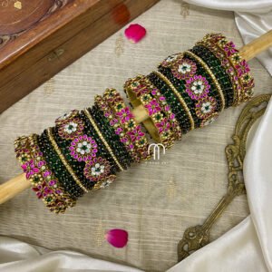 • 4- 3D Single Line Kundan Bangles, 2 – Lily Jumbo kada, Glass Bangles – 28 Bangles.