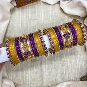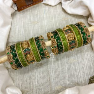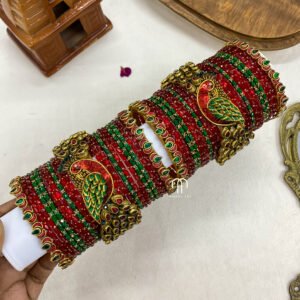 • Entire set contains 4 – single line Kundan Bangles, 2 – Peacock kada, Glass Bangles -36 Glass Bangles.
