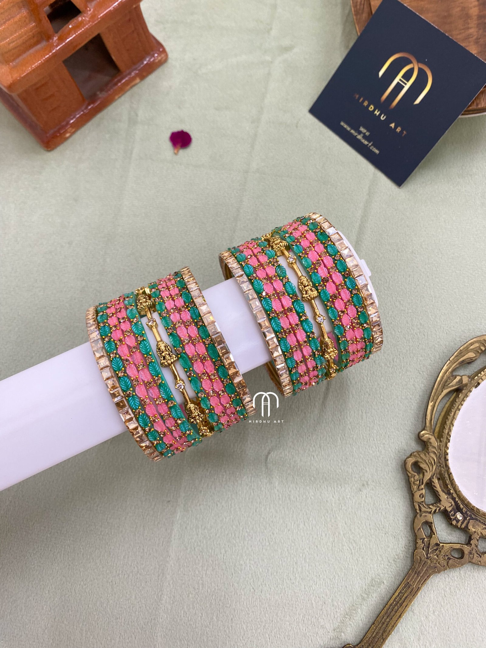 Kundan Bangles – Flower & Parrot (Rani Pink And Turquoise Green )