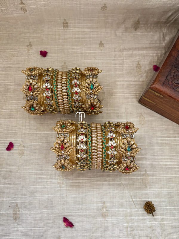 • Center Bangle contains only 2 – 3D statement Blossom Jumbo Kada Kundan Bangles