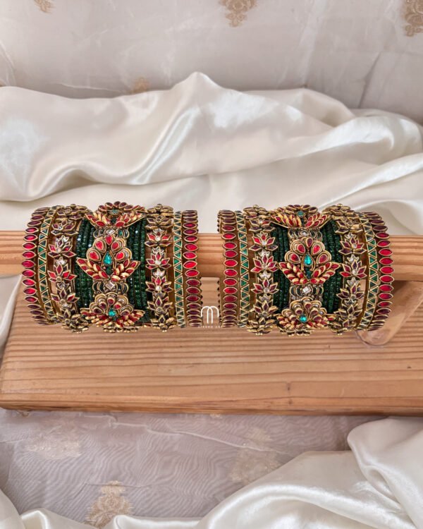 Kundan Bangles – 3D Blossom Statement with lotus Kada (Red And Green)