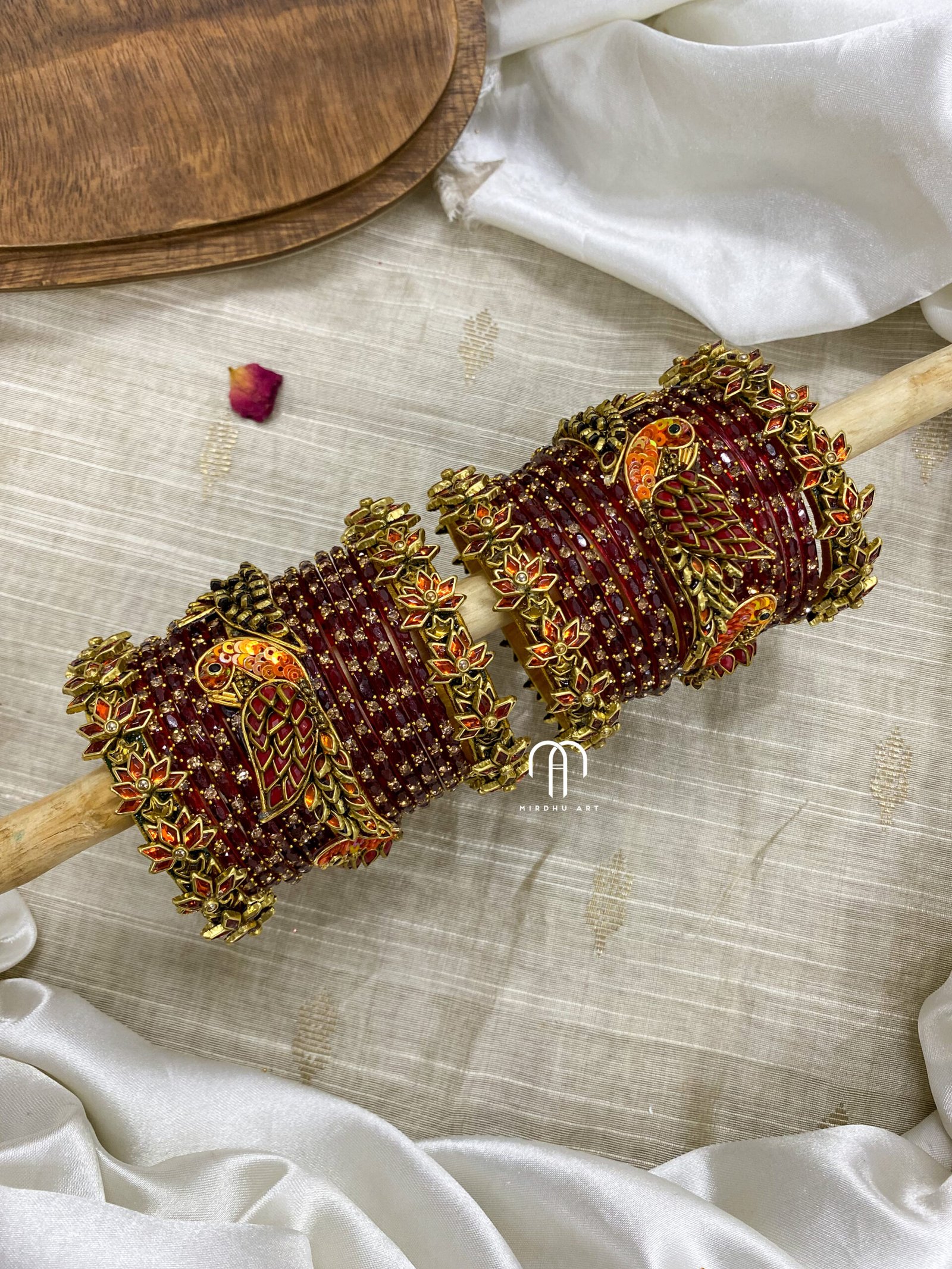 - Entire set contains 4- 3D kada Kundan Bangles, 2 – Parrot kada, Glass Bangles -24 Bangles.