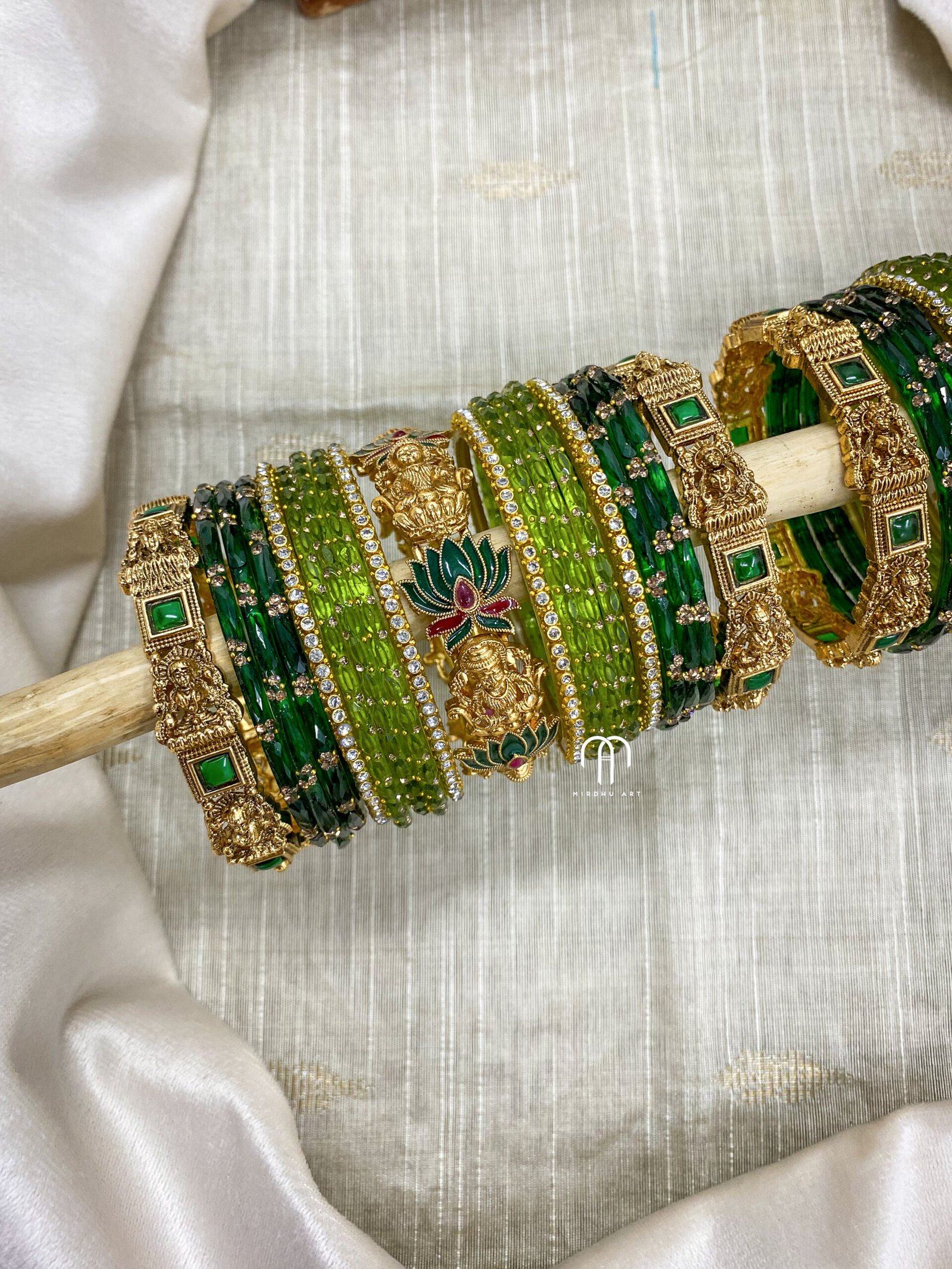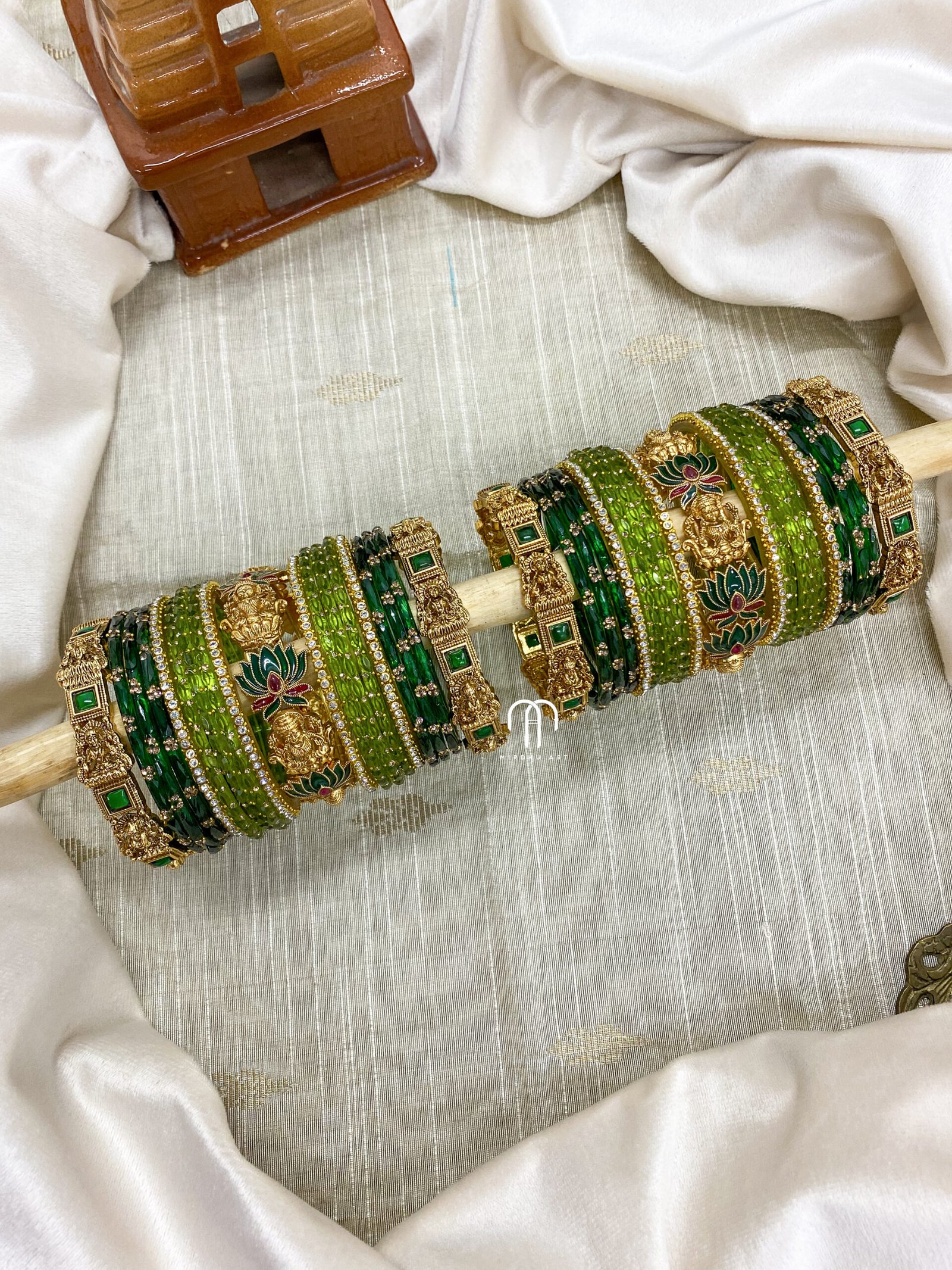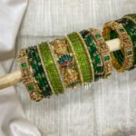 - Entire set contains 4 – single line Kundan Bangles, 2 – Peacock kada, Glass Bangles -36 Glass Bangles.