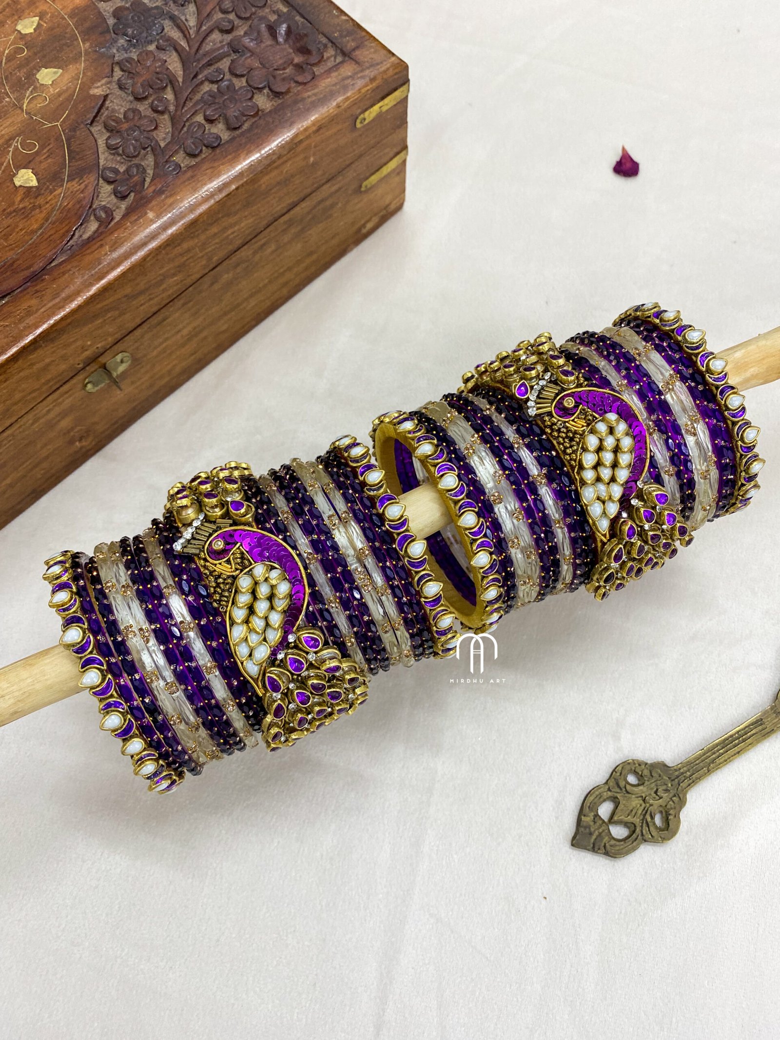 - Entire set contains 4 – single line Kundan Bangles, 2 – Peacock kada, Glass Bangles -36 Glass Bangles.