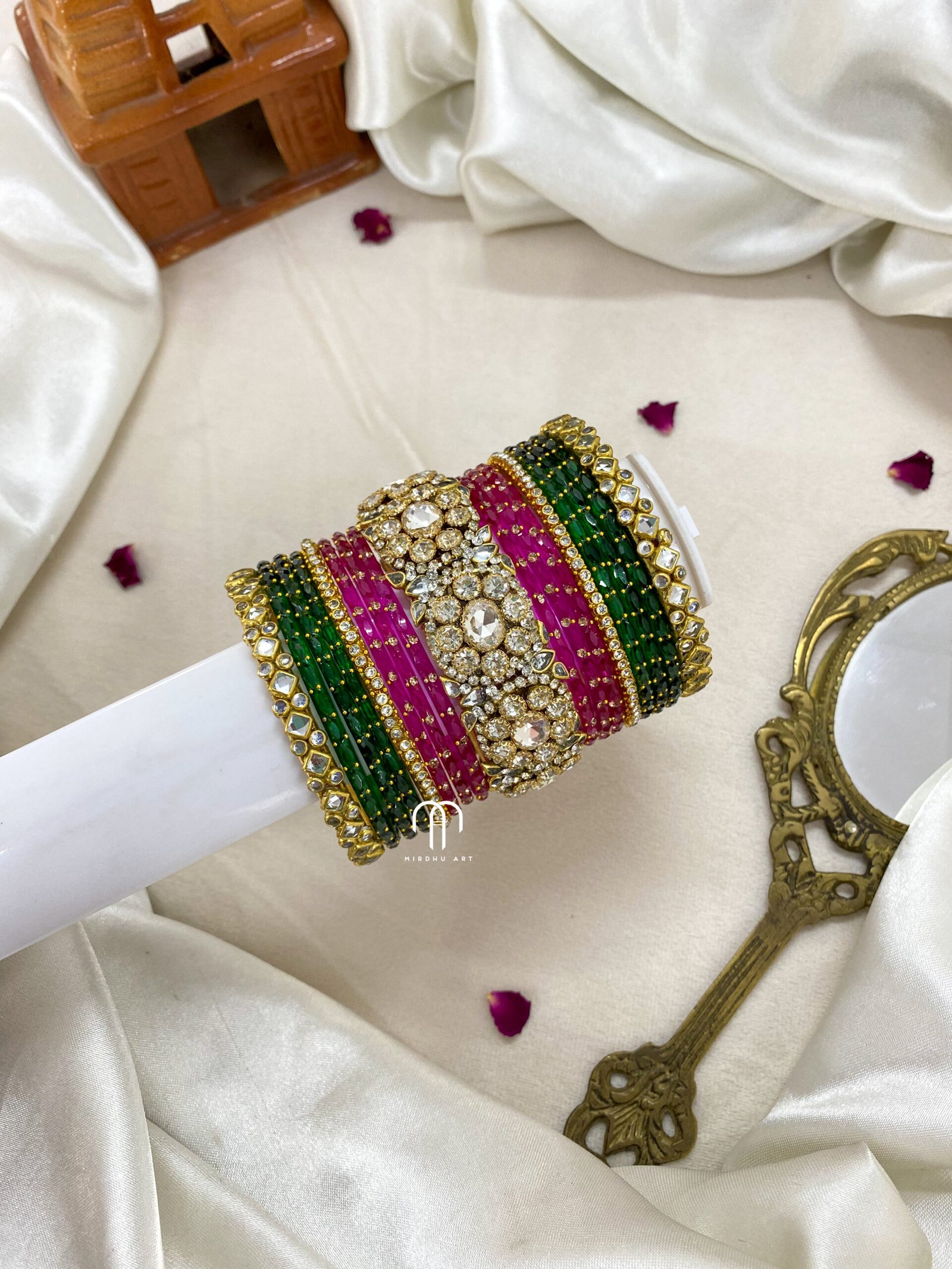 - Kundan Bangles except Glass Bangles contains (2) 3D Malar Jumbo kada, 4 – Single line bangles.