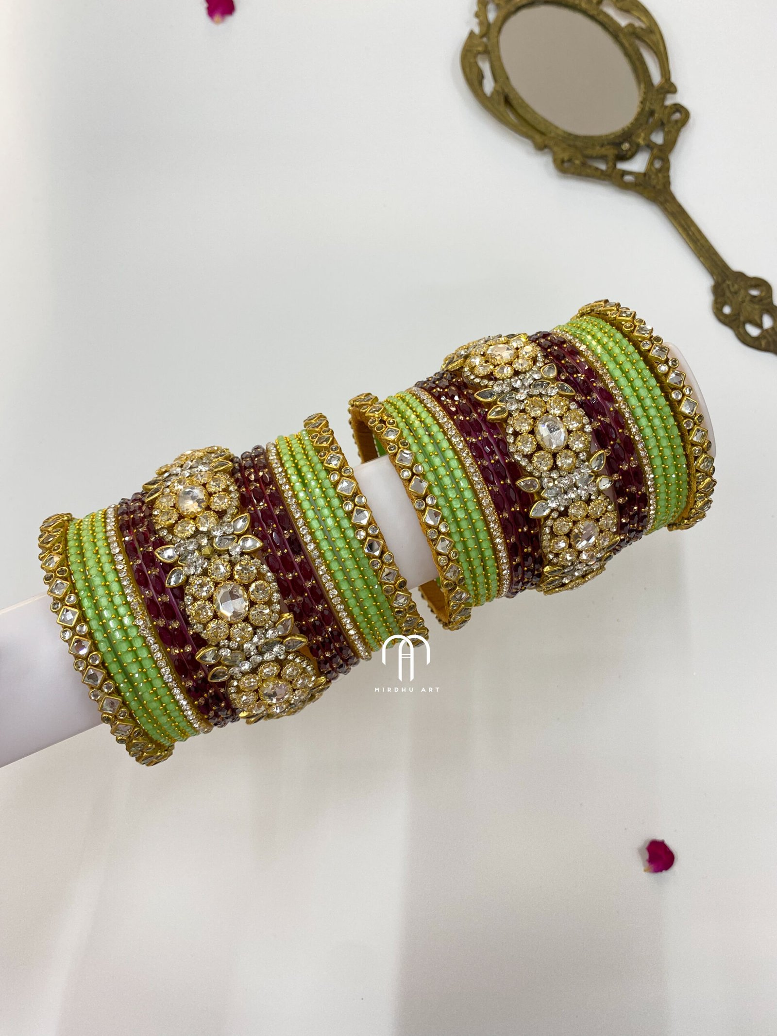 Polki Diamond Replica Bangles – Wine and Pista Green